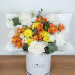 Букет “Симфония солнечного света” — это взрыв ярких эмоций и теплого настроения. Белоснежные розы, символизирующие чистоту и элегантность, идеально сочетаются с жизнерадостными жёлтыми хризантемами и огненно-оранжевыми альстромериями. Эвкалипт добавляет свежести и легкости композиции. Упакован в стильную белую коробку, этот букет станет прекрасным подарком для поздравлений, поднятия духа или просто чтобы осветить чей-то день.