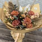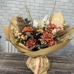 Ваксфлауэр - 3 шт. Лента - 1 шт. Маттиола - 3 шт. Эвкалипт - 3 шт. Упаковка - 5 шт. Сантини - 3 шт. скиммия красная (Rubella) - 1 шт. пампасная трава - 3 шт. гортензия стабилизированная - 1 шт. пальма сухоцвет - 2 шт. роза barista - 5 шт.