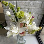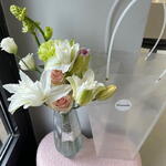 Лилия - 1 шт. Роза - 3 шт. Эустома - 1 шт. Орнитогалум - 2 шт. Ваза стекло - 1 шт. переноска для цветов - 1 шт. эустома зеленая ветка - 1 шт.