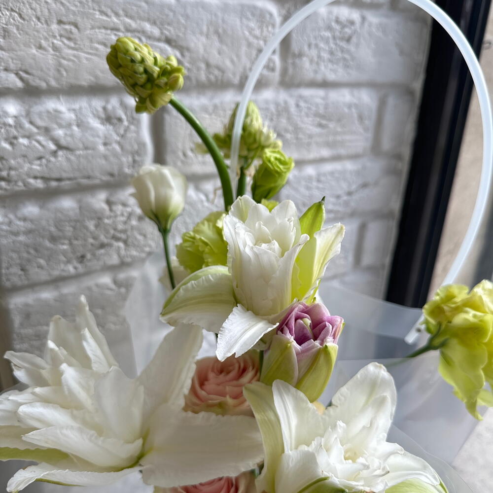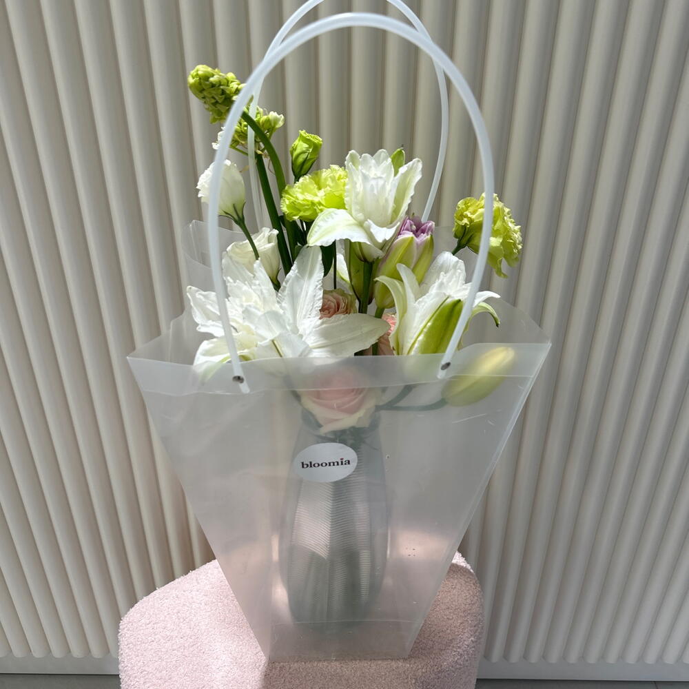 Лилия - 1 шт. Роза - 3 шт. Эустома - 1 шт. Орнитогалум - 2 шт. Ваза стекло - 1 шт. переноска для цветов - 1 шт. эустома зеленая ветка - 1 шт.
