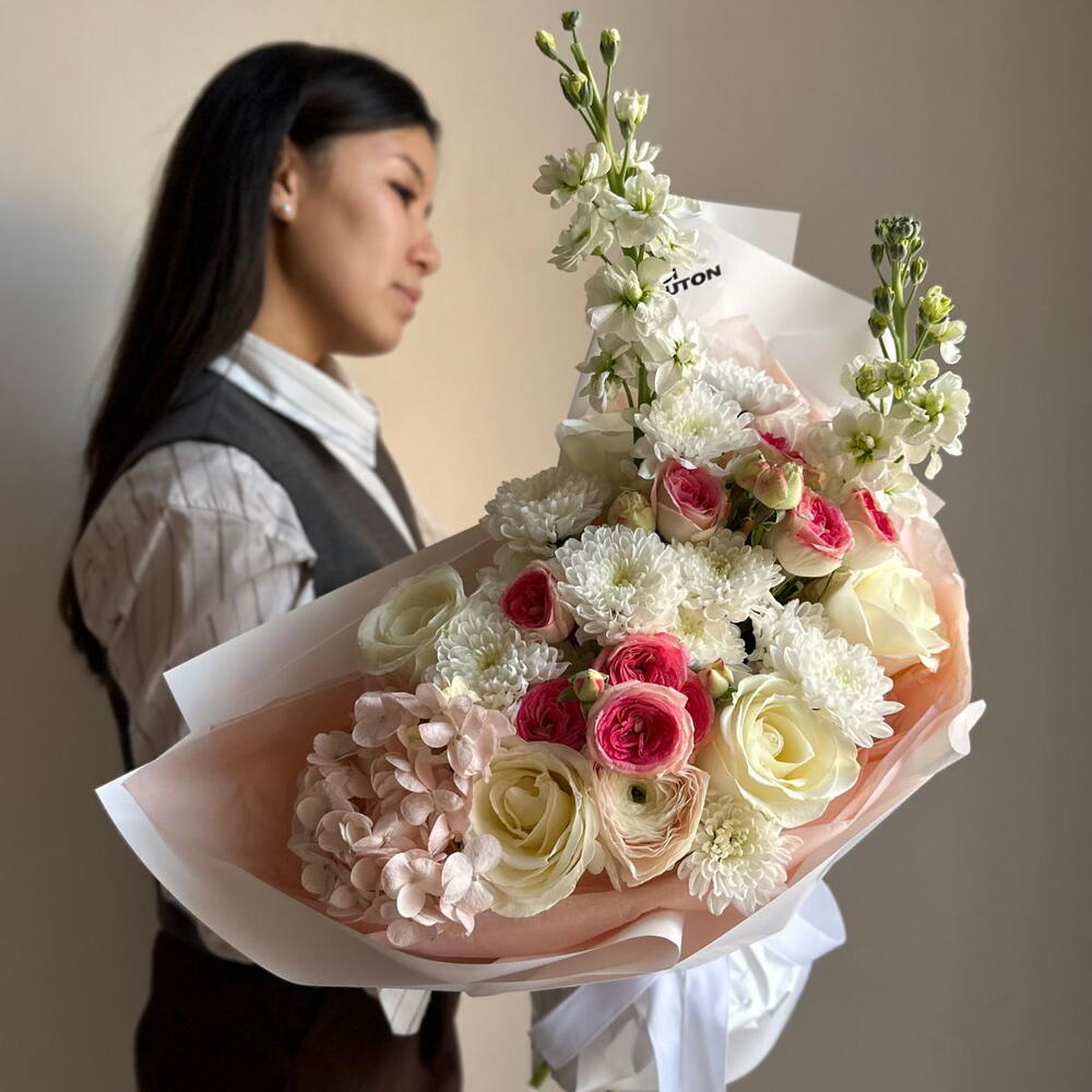 Гортензия - 1 шт. Маттиола - 2 шт. Хризантема - 4 шт. Ранункулюс - 1 шт. розы - 4 шт. кустовые розы - 2 шт.