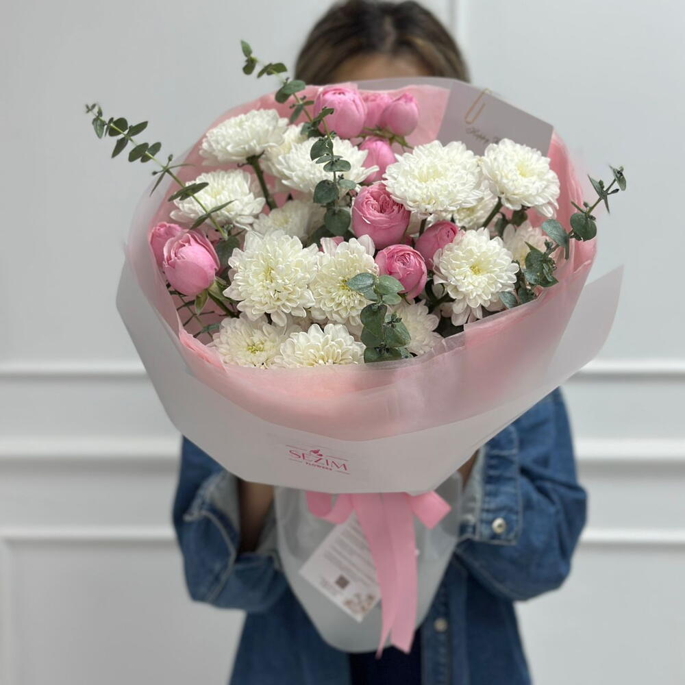 Хризантема кустовая - 3 шт. Эвкалипт - 1 шт. Кустовая роза - 3 шт.