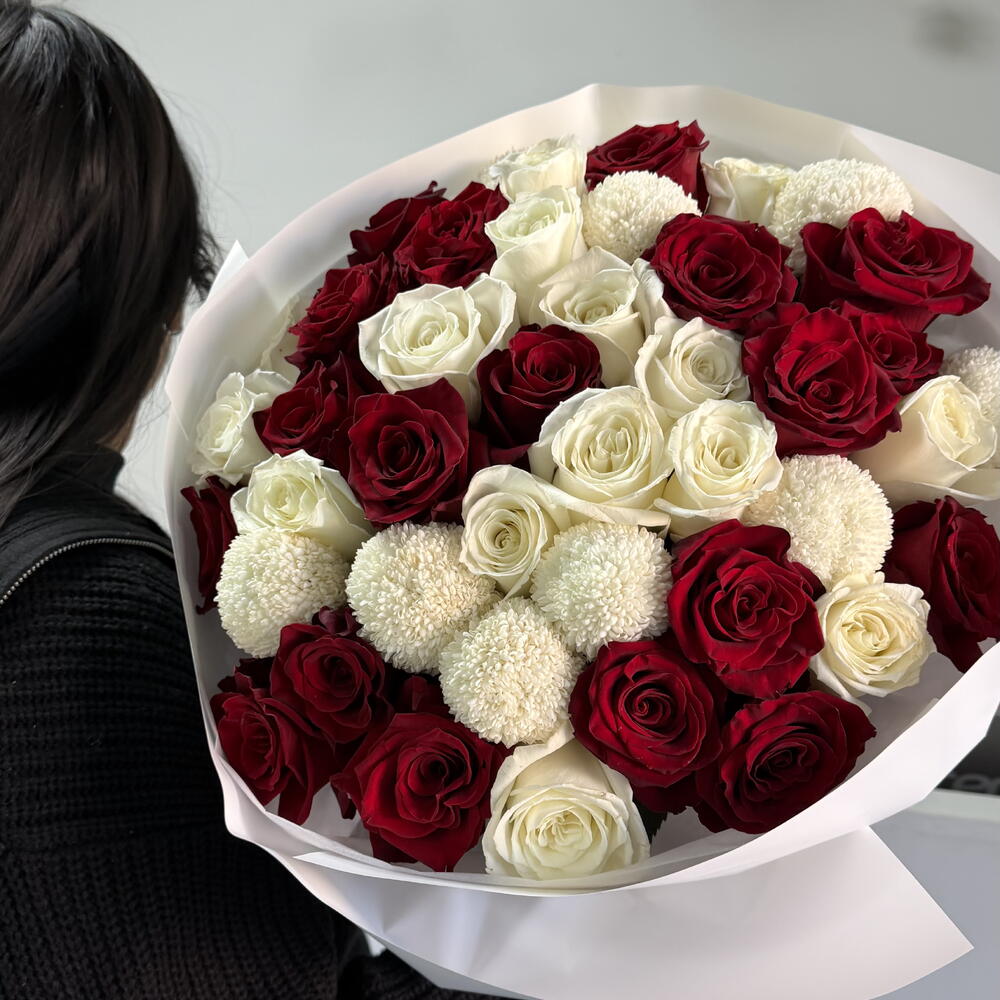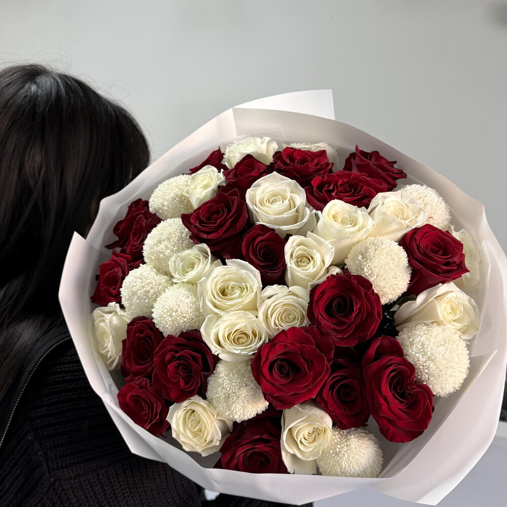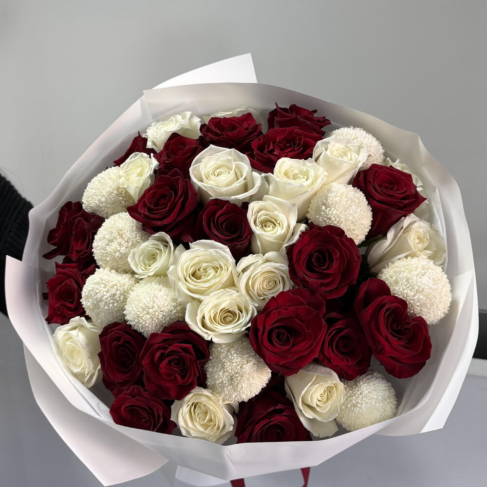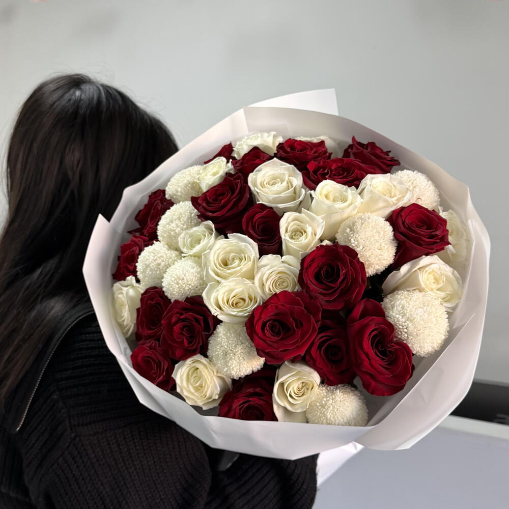 Роза Эквадор - 35 шт. Лента атласная - 1 шт. Упаковка дизайнерская - 3 шт. Кризал - 1 шт. момоко хризантема - 9 шт.