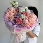Гортензия - 2 шт. Хризантема кустовая - 1 шт. Эустома - 1 шт. Диантус - 3 шт. Роза фиолетовая - 5 шт. Упаковка дизайнерская - 5 шт.