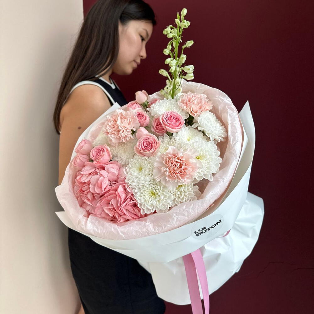 Гортензия - 1 шт. Дельфиниум - 1 шт. Диантус - 3 шт. хризантемы - 4 шт. кустовые розы - 2 шт.