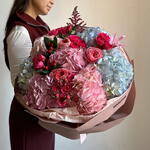Букет из гортензий, кустовых роз, астильба, гиперикума, наринэ и пионовидных роз. Букет, в котором каждая деталь говорит о чувствах. Нежные оттенки, изысканная форма и аромат, от которого хочется улыбаться