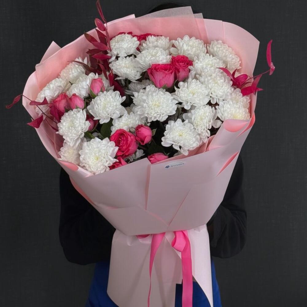 Кустовая пионовидная роза - 3 шт. хризантемы кустовые - 6 шт. эвкалипт италия - 2 шт. аква бумага - 1 шт.