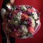 Эвкалипт - 4 шт. Диантус - 7 шт. хризантемы - 7 шт. гортензии - 10 шт. кустовые розы - 10 шт.