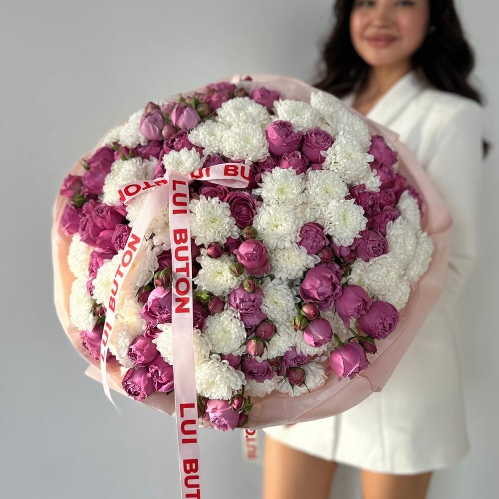 Воздушный букет из кустовых пионовидных роз и хризантем, который сразу привлекает внимание своими мягкими оттенками. Идеальный подарок, когда хочется произвести впечатление без лишних слов. Смотрится дорого и очень трогательно