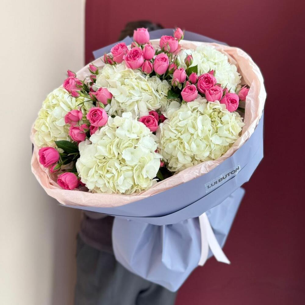 Букет из гортензий и кустовых роз с оформлением. Этот букет поможет выразить любовь, благодарность и заботу без лишних слов.