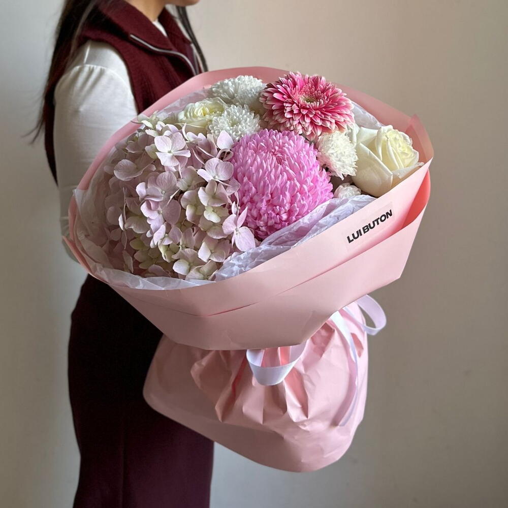 Букет из гортензии, одноголовой хризантемы, герберы, роз и кустовых хризантем, способный сказать больше, чем слова. Для моментов, когда важна искренность, внимание и утонченность