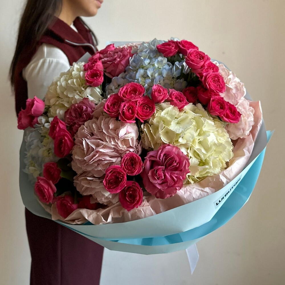 Букет из кустовых роз, гортензий и пионовидных роз. Он выглядит так, будто собран из кусочков счастья: мягкие цвета, идеальное сочетание и настроение праздника внутри каждого бутона