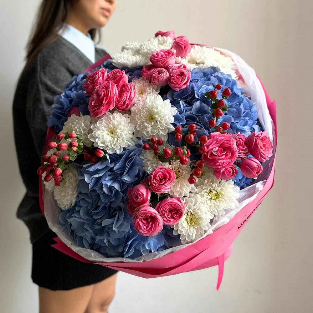 Гиперикум - 3 шт. хризантемы - 5 шт. гортензии - 3 шт. кустовые розы - 5 шт.