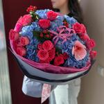 Гиперикум - 4 шт. Гортензия - 5 шт. орхидея - 1 шт. Нерина - 1 шт. кустовые розы - 6 шт.