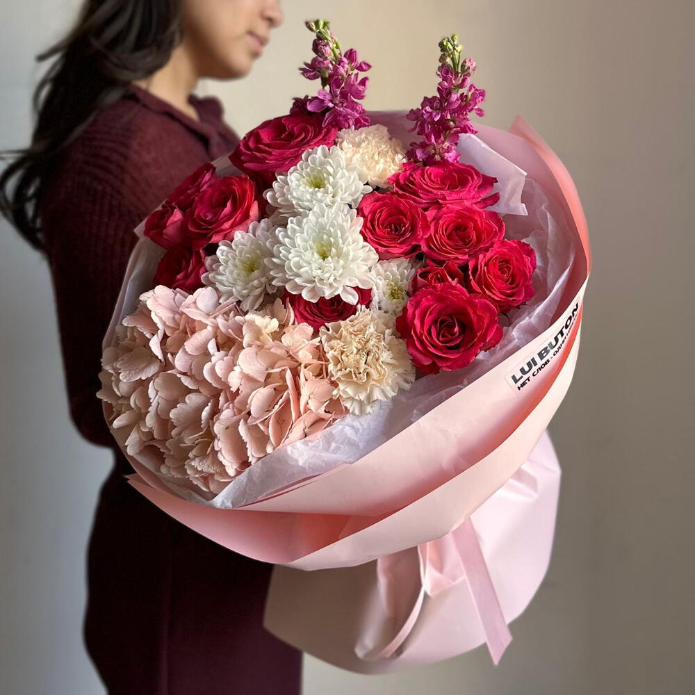 Гортензия - 1 шт. Маттиола - 2 шт. Хризантема - 1 шт. Диантус - 2 шт. кустовые розы - 3 шт.