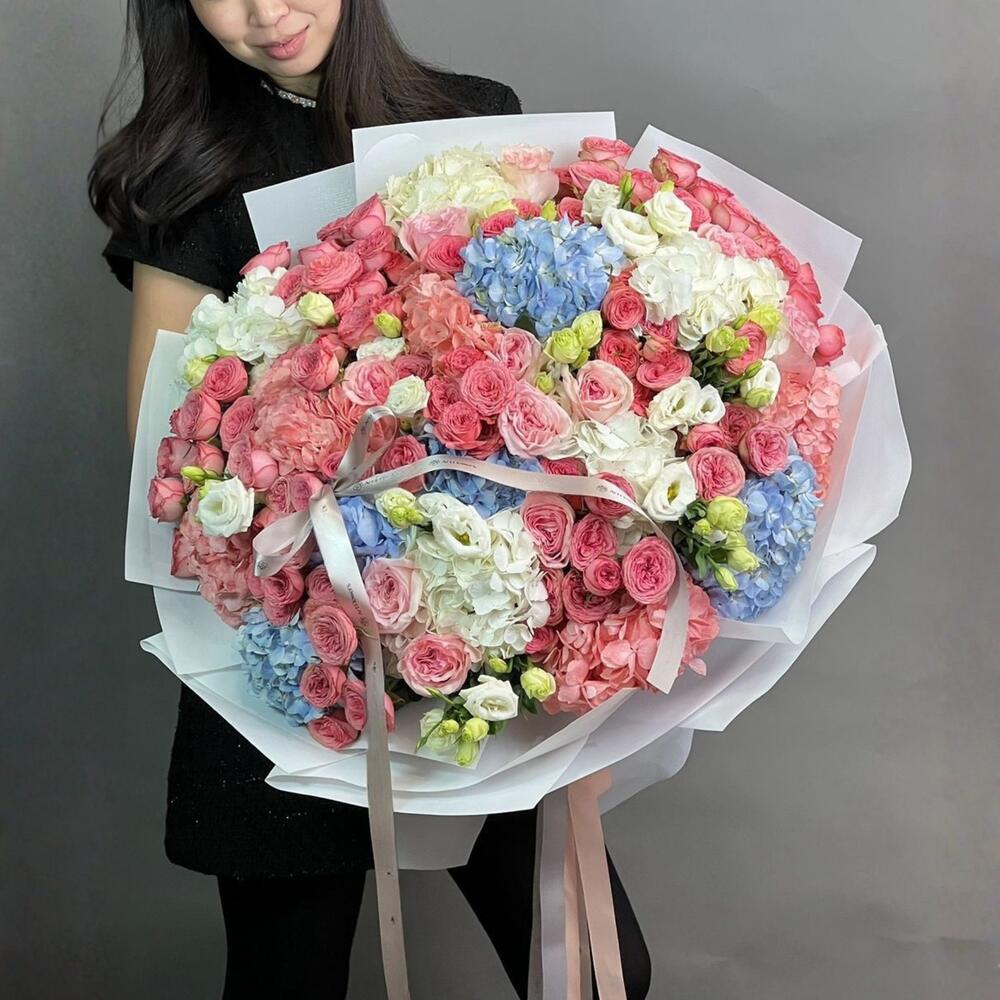 Гортензия - 15 шт. Лизиантус - 15 шт. Кустовая роза - 17 шт. аквабумага - 2 шт.