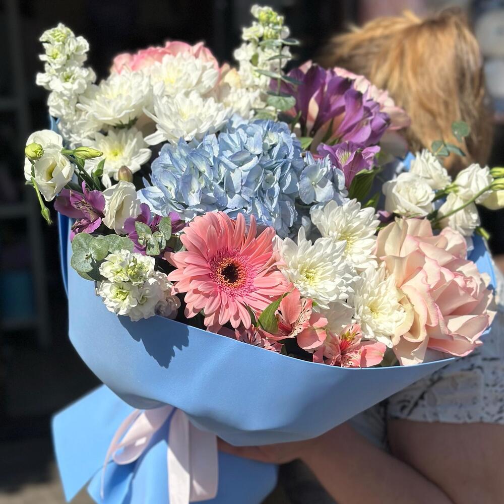 Альстромерия - 5 шт. Гортензия - 1 шт. Лизиантус - 3 шт. Маттиола - 3 шт. Хризантема кустовая - 2 шт. Эвкалипт - 5 шт. Гербера - 1 шт.