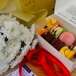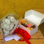 Очаровательный набор — букет свежих хризантем и бокс изысканных макарон. Нежные цветы символизируют заботу и внимание, а воздушные макарон добавляют сладости и изящества. Идеальный подарок, чтобы порадовать близкого человека и подарить немного тепла и уюта