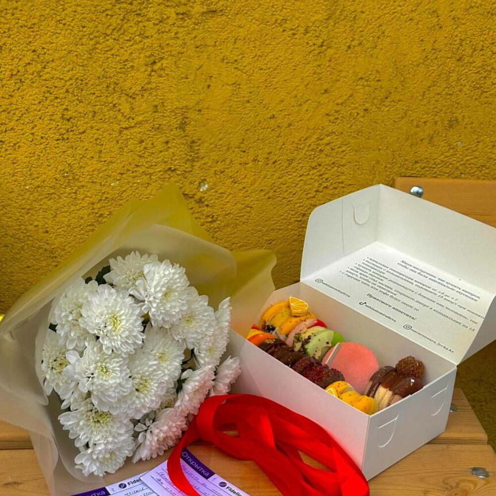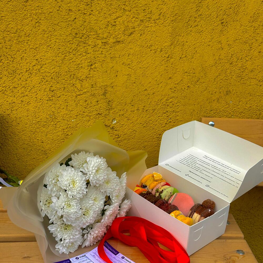 Очаровательный набор — букет свежих хризантем и бокс изысканных макарон. Нежные цветы символизируют заботу и внимание, а воздушные макарон добавляют сладости и изящества. Идеальный подарок, чтобы порадовать близкого человека и подарить немного тепла и уюта