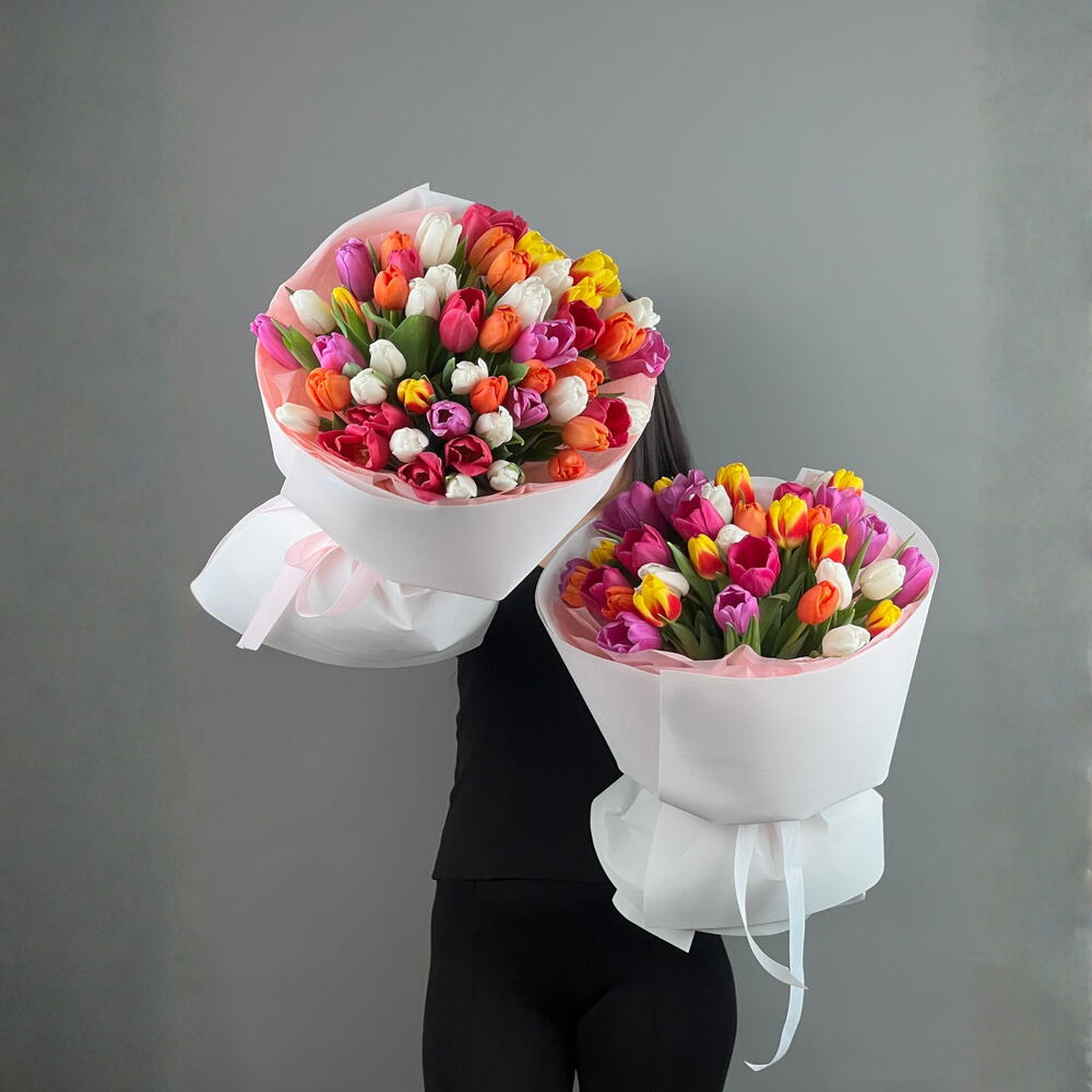 Яркий и эффектный набор из двух букетов тюльпанов микс — 51 и 35 цветов. Такой набор идеально подойдёт, если вы хотите сделать сразу несколько красивых подарков одним заказом. Большой букет станет главным подарком для самого близкого человека, а второй букет прекрасно подойдёт для мамы, сестры, подруги или коллеги. Разноцветные тюльпаны создают атмосферу настоящего весеннего праздника. В букете сочетаются разные оттенки, благодаря чему композиция выглядит очень живой, яркой и праздничной. Такой набор удобно заказать, когда нужно поздравить несколько людей одновременно. Один заказ — и сразу два красивых букета для ваших близких.