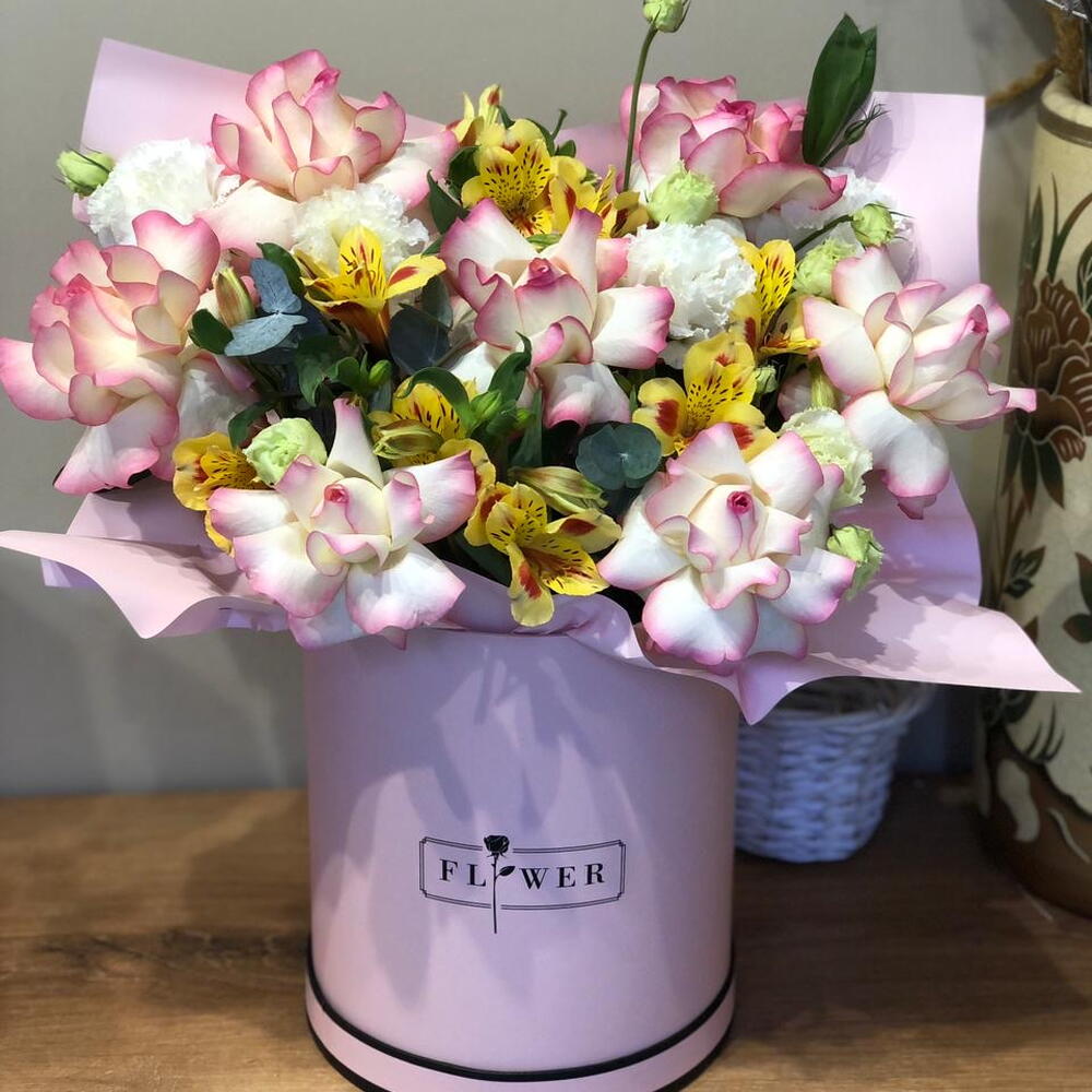 Альстромерия - 4 шт. Лизиантус - 3 шт. Эвкалипт - 3 шт. французские розы - 7 шт.