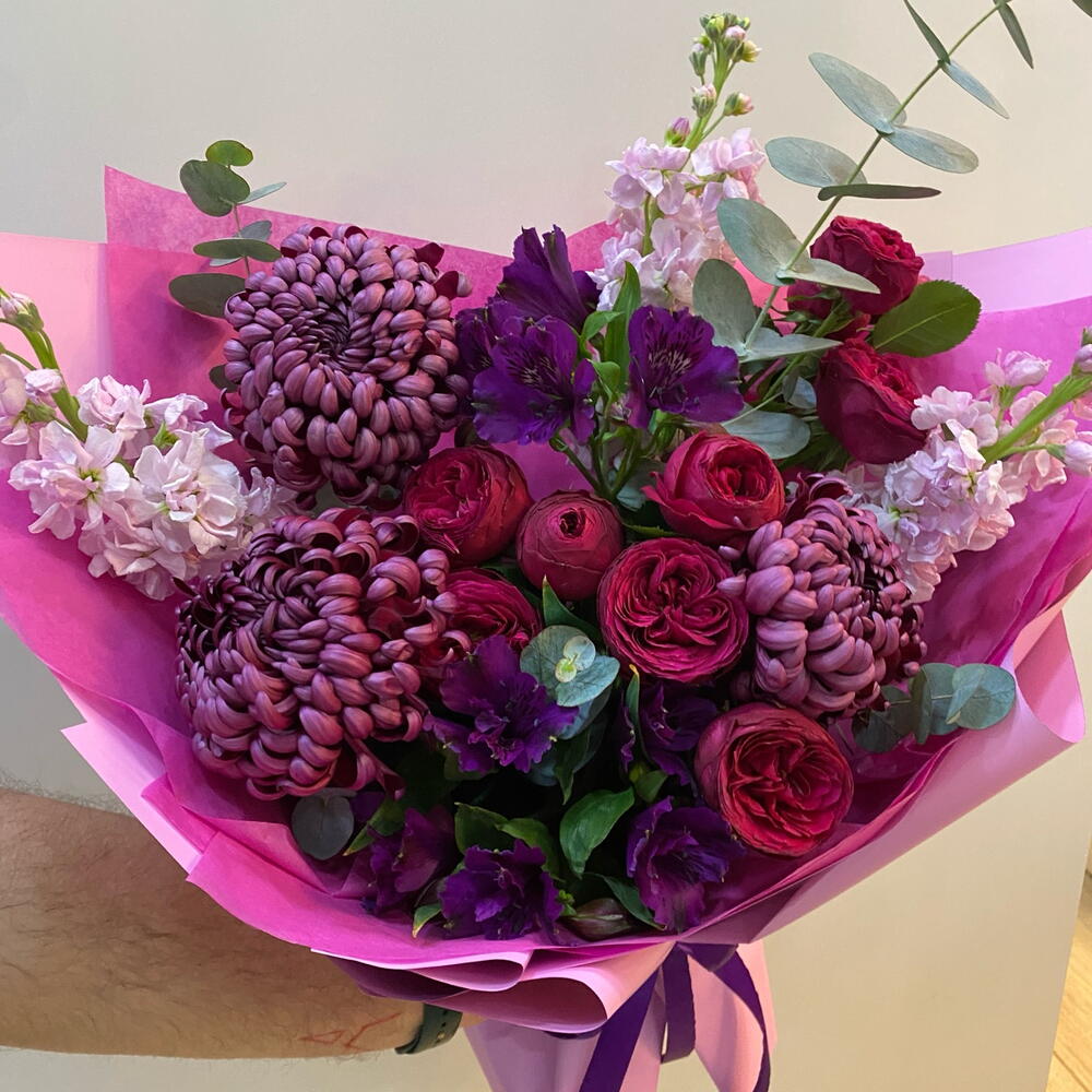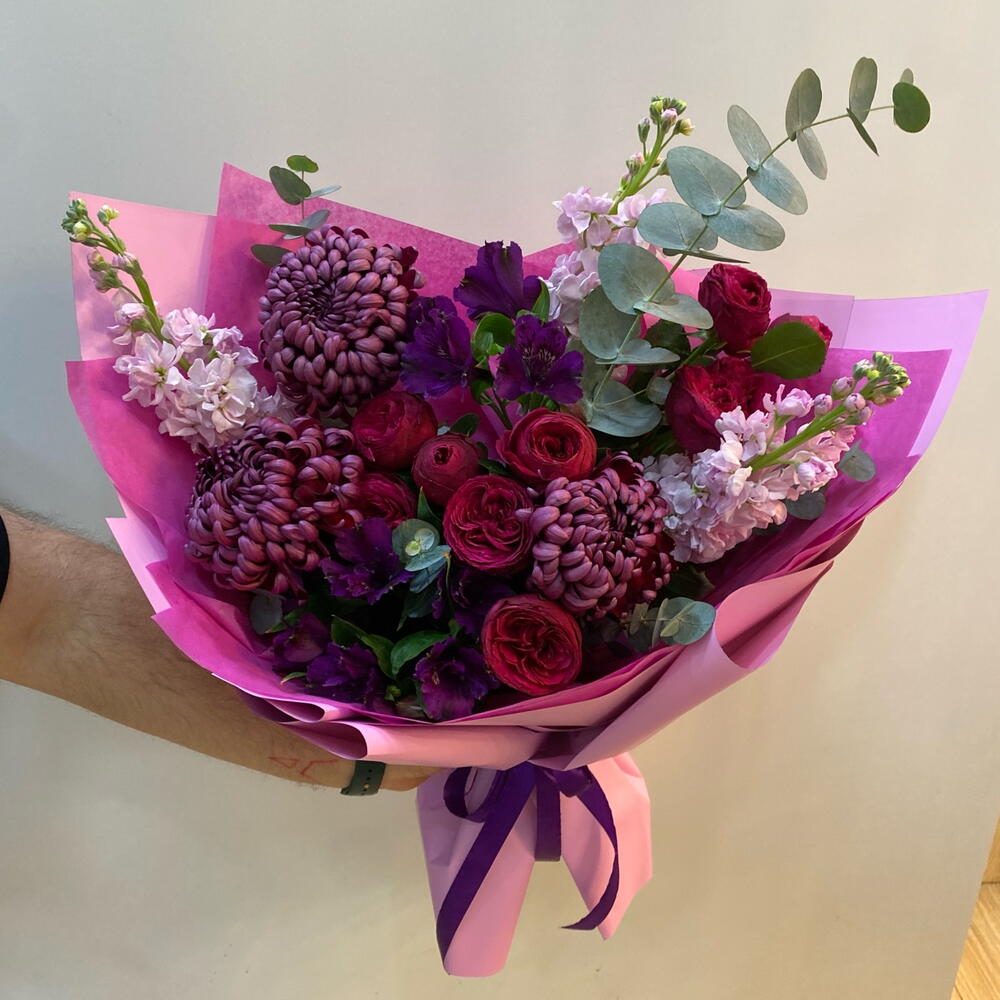 Элегантный букет с кустовой розой сорта ред пиано и хризантемами бигуди, маттиолой и альстромерия с эвкалиптом.