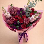 Альстромерия - 2 шт. Маттиола - 3 шт. Эвкалипт - 1 шт. Red Piano кустовая роза - 2 шт. хризантема бигуди фиолетовая - 3 шт.