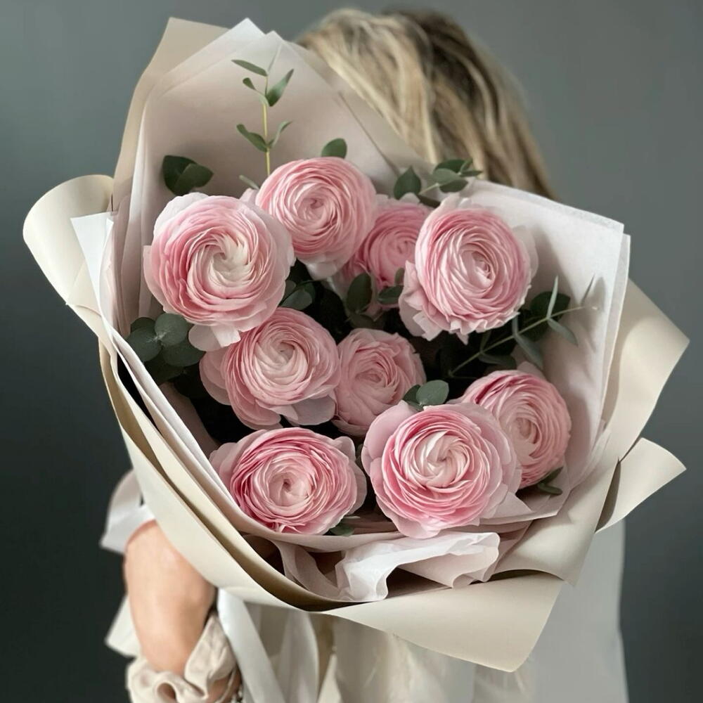 Упаковка дизайнерская - 2 шт. Открыточка с вашими пожеланиями - 1 шт. Эвкалипт Цинерея - 3 шт. Инструкция по уходу - 1 шт. витамины для цветов (кризал) - 1 шт. Ранункулус - 9 шт.