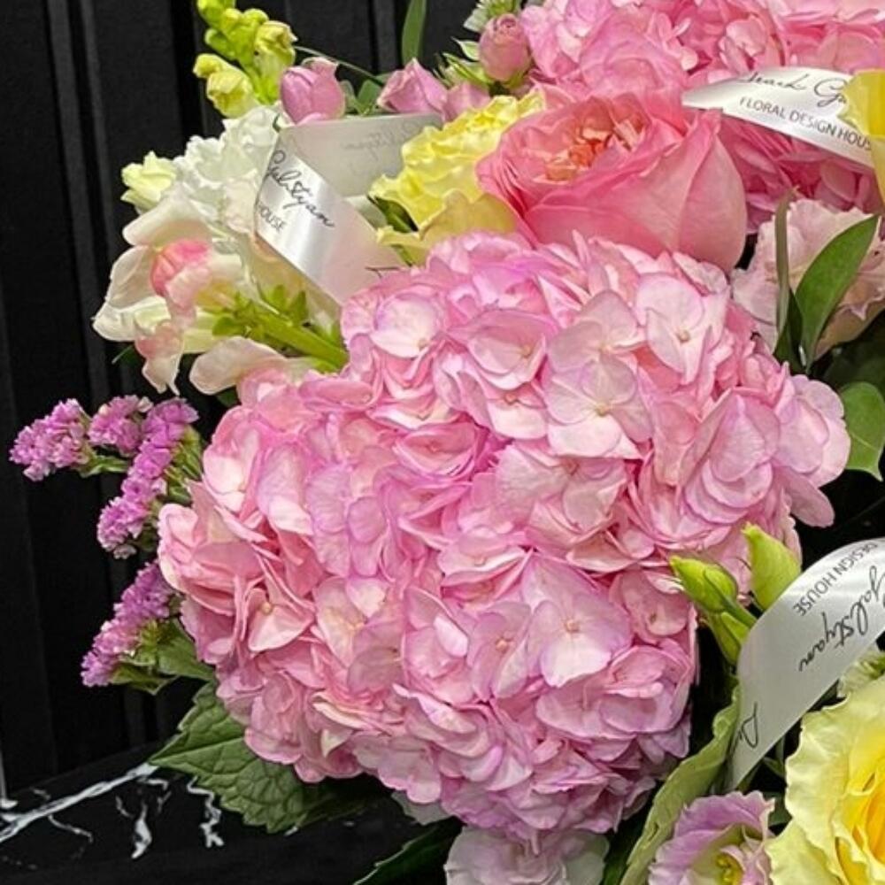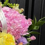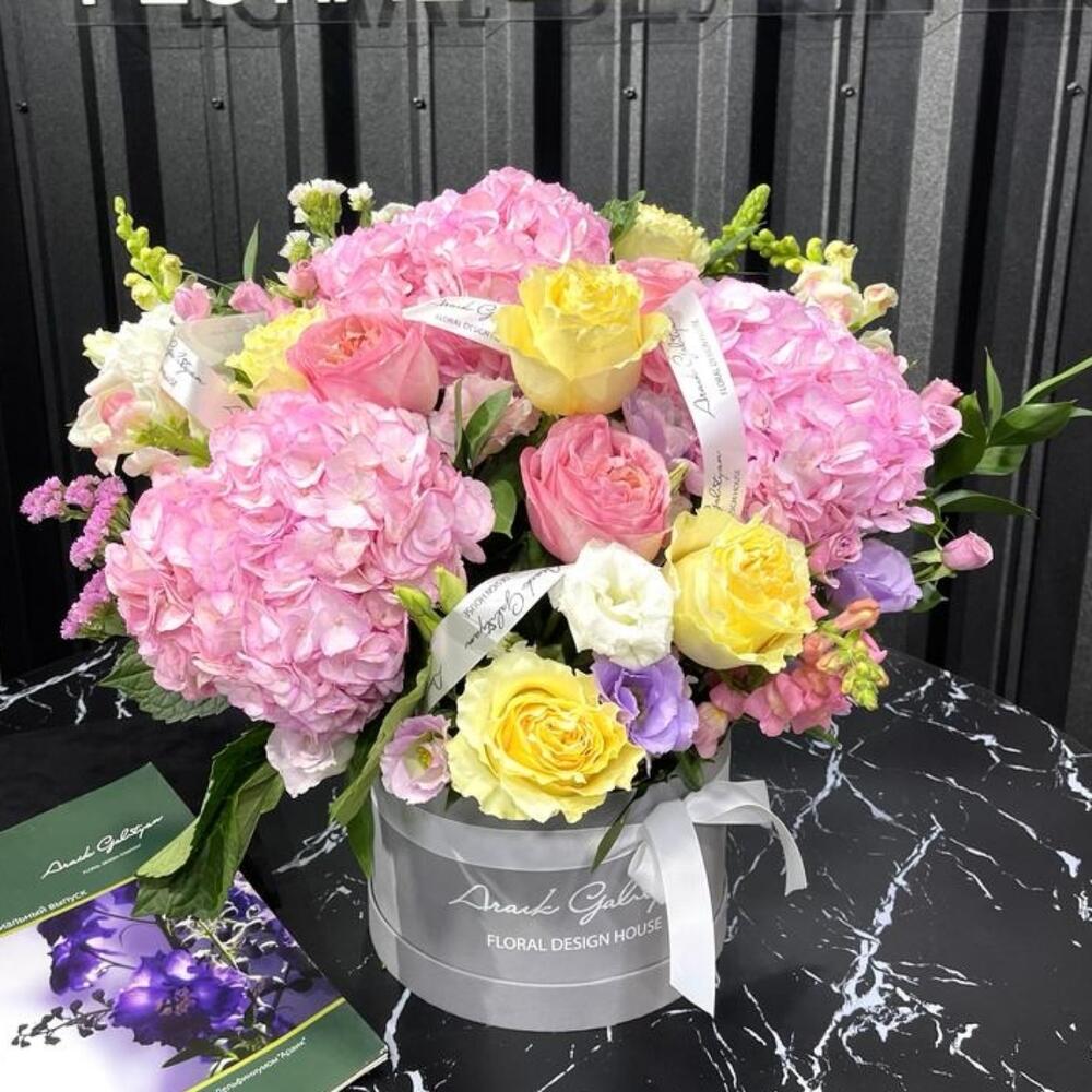 Нежная, зефирная, пушистая коробка с гортензиями и розами обрадует любую. А лизиантусы придадут дню хорошее настроение и позитивный день.