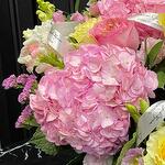 Лизиантус - 4 шт. Роза кустовая - 2 шт. Рускус - 7 шт. Статица - 3 шт. Роза - 8 шт. Львиный зев - 5 шт. Гортензия розовая - 3 шт. зелень альстромерия - 3 шт.