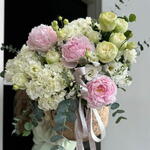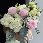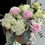 Гортензия - 4 шт. Маттиола - 5 шт. Пион - 3 шт. Хризантема кустовая - 2 шт. Эвкалипт - 3 шт. Эустома - 2 шт. Роза пионовидная - 5 шт. Корзина плетеная - 1 шт.