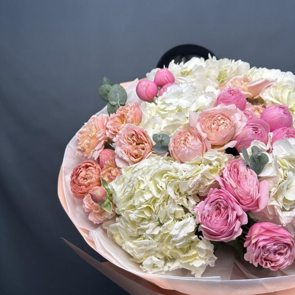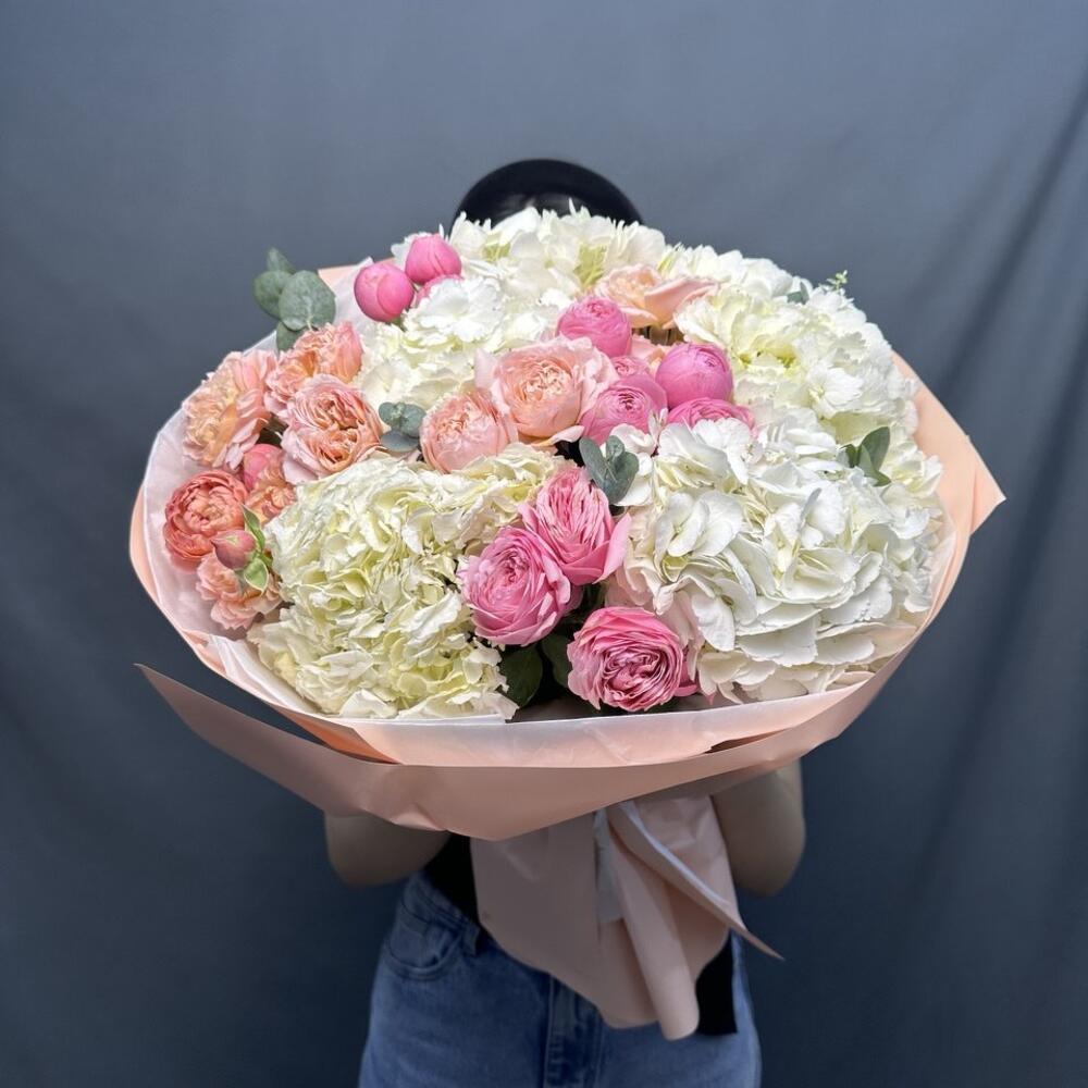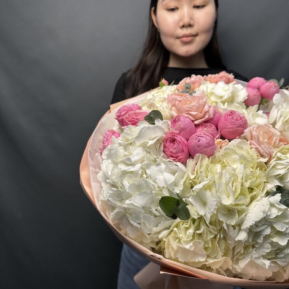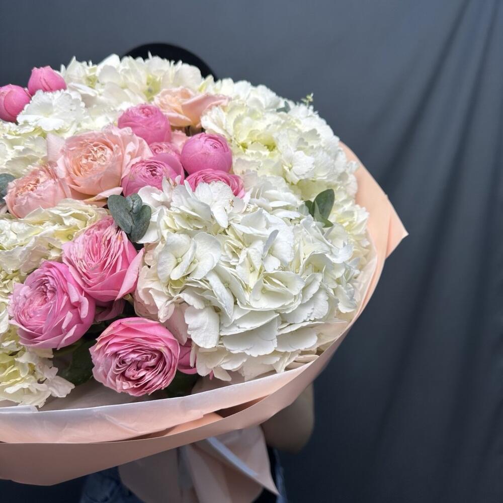 Гортензия - 7 шт. Кустовая роза - 10 шт. Лента атласная - 1 шт. Упаковка дизайнерская - 5 шт.
