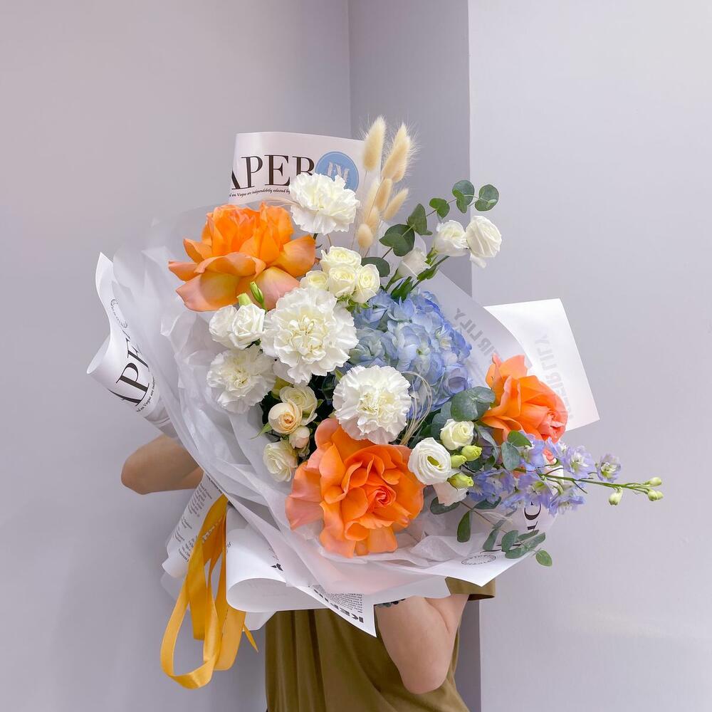 Гортензия - 1 шт. Дельфиниум - 1 шт. Роза кустовая - 3 шт. Эвкалипт - 1 шт. Роза - 3 шт. Эустома - 2 шт. Диантус - 4 шт. Лагурус - 1 шт.
