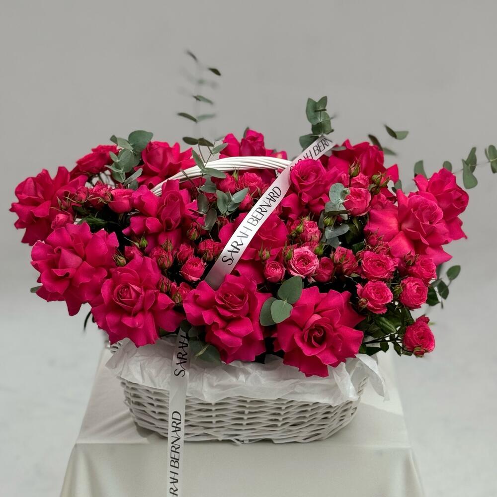 Корзина - 1 шт. Эвкалипт - 5 шт. Роза - 15 шт. Кустовая роза - 7 шт.