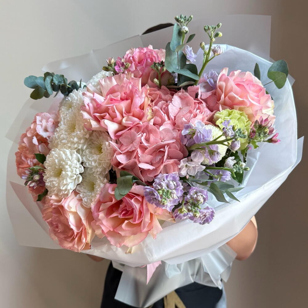Этот неповторимый авторский букет станет изысканным подарком для любого праздника. Сочетание 2 штук шаровидной гортензии, 5 роз, 3 хризантем премиум и 1 гвоздики, представляет собой восхитительное цветовое разнообразие. Дерзкий акцент в виде пыхтящей маттиолы кустовой (3 шт.) дополняет воздушную, нежную композицию. Эвкалипт, добавленный в количестви 1 штука, представляет контраст прохладным оттенком и придает букету нотку свежести. Именно этот букет способен стать украшением любого интерьера и поднять настроение даже в самый серый день.