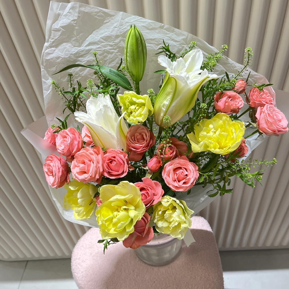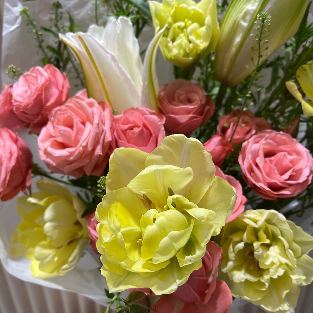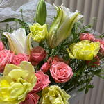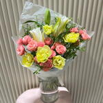 Лилия - 1 шт. Тюльпан Пионовидный - 5 шт. Спрей роза - 3 шт. переноска для цветов - 1 шт. пастушка - 5 шт.