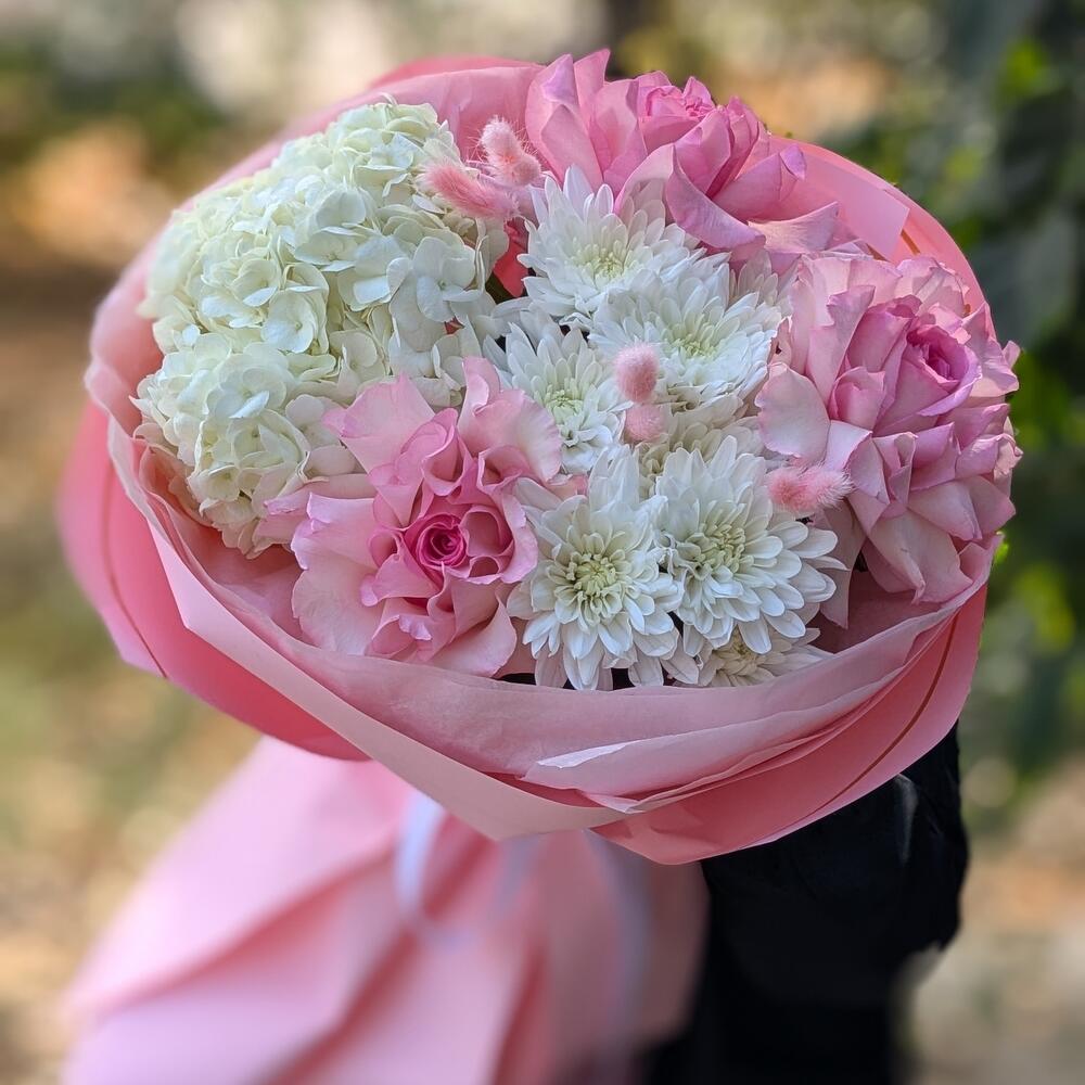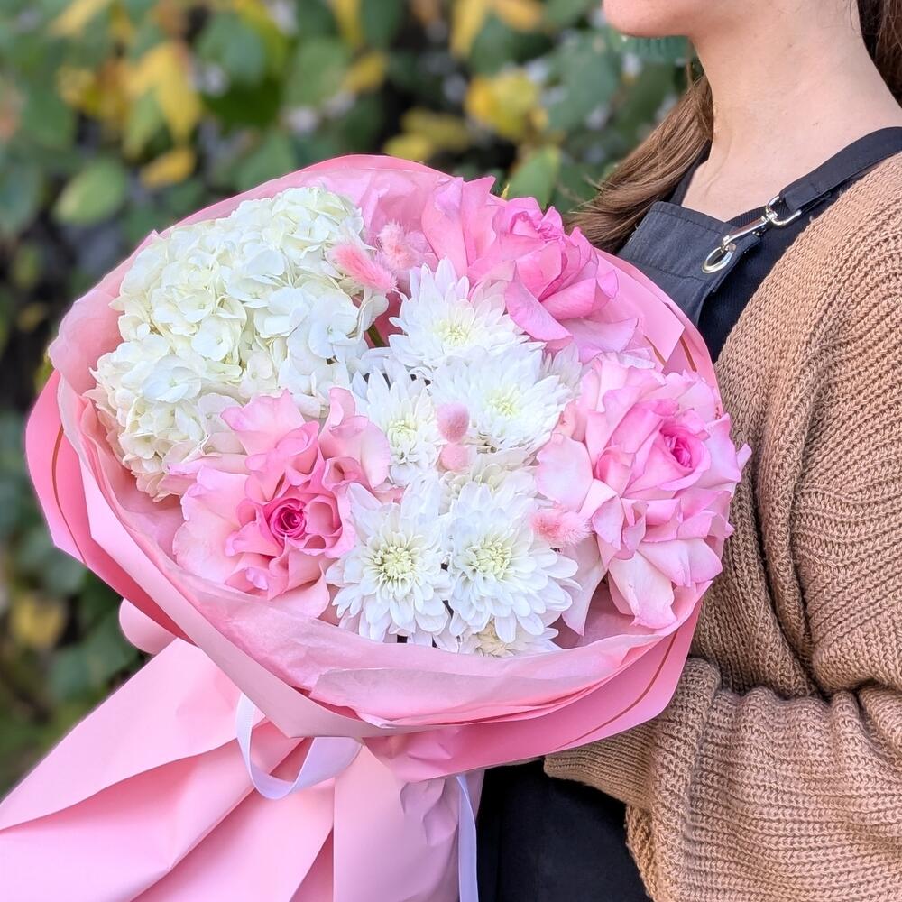 Нежный букет с гортензией и розами "Цветочный коктейль" S