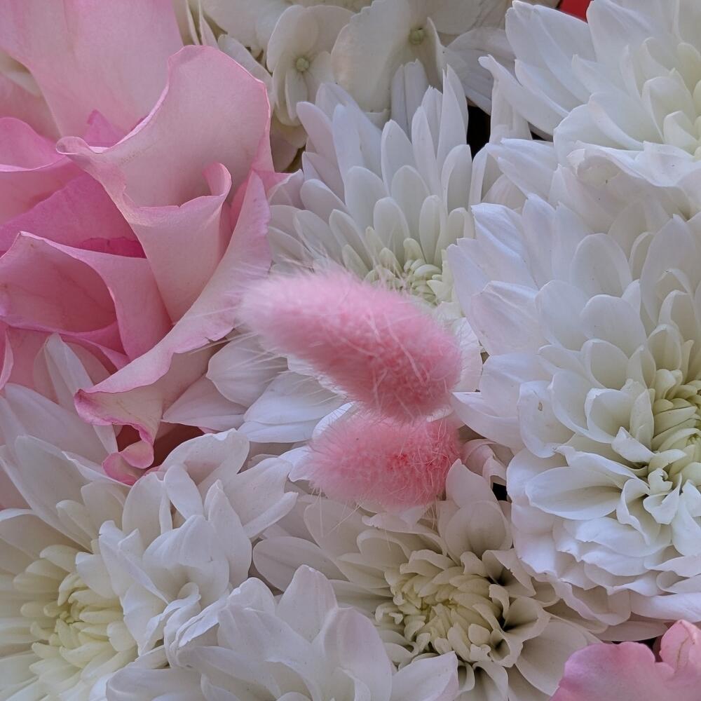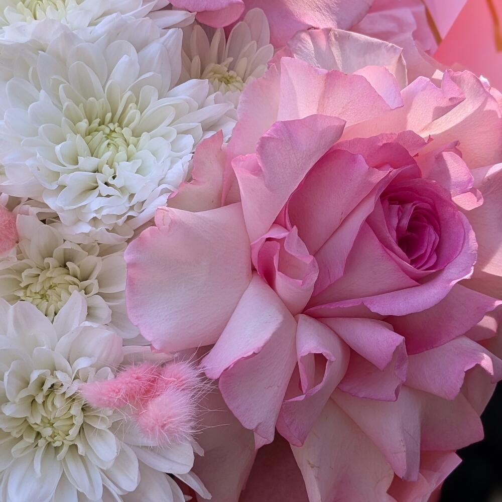 Гортензия - 1 шт. Хризантема кустовая - 2 шт. Роза - 3 шт. Лагурус - 6 шт.