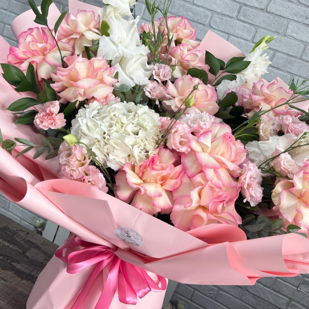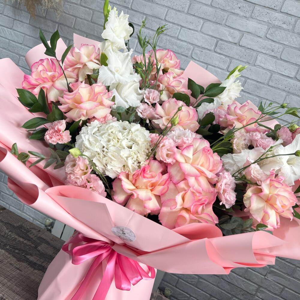 Гортензия - 1 шт. Лизиантус - 5 шт. Рускус - 7 шт. Эвкалипт - 5 шт. Упаковка - 10 шт. Бант - 1 шт. Гладиолус - 3 шт. Французская роза - 11 шт.