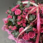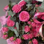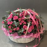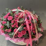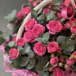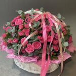 Корзина - 1 шт. Эвкалипт - 3 шт. Кустовая роза - 17 шт. Тишью - 2 шт. Бант - 1 шт. Оазис флористический - 1 шт.