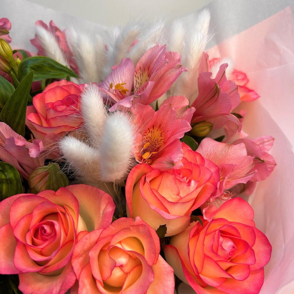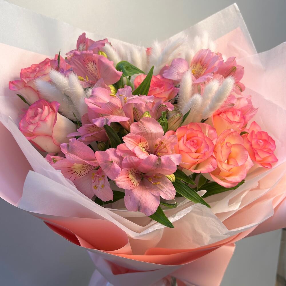 Альстромерия - 3 шт. Роза - 9 шт. Оформление - 1 шт. Лагурус - 1 шт.