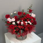 элегантная цветочная композиция, размещённая в цилиндрической серо-золотистой коробке с декоративным шнурком и кисточкой. Композиция состоит в основном из ярко-красных роз, дополненных нежно-розовыми мини-гвоздиками и зелёной листвой. Цветы обрамлены красной и прозрачной
