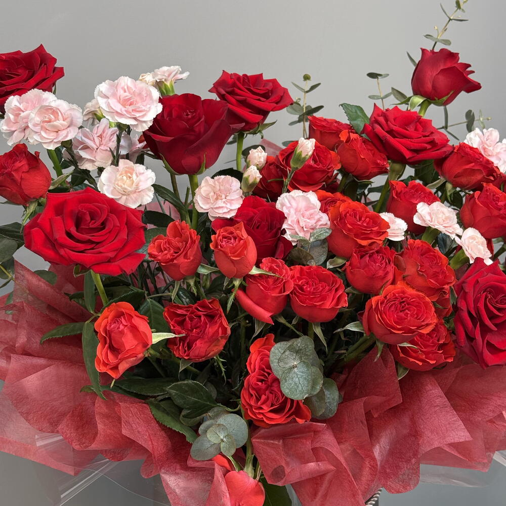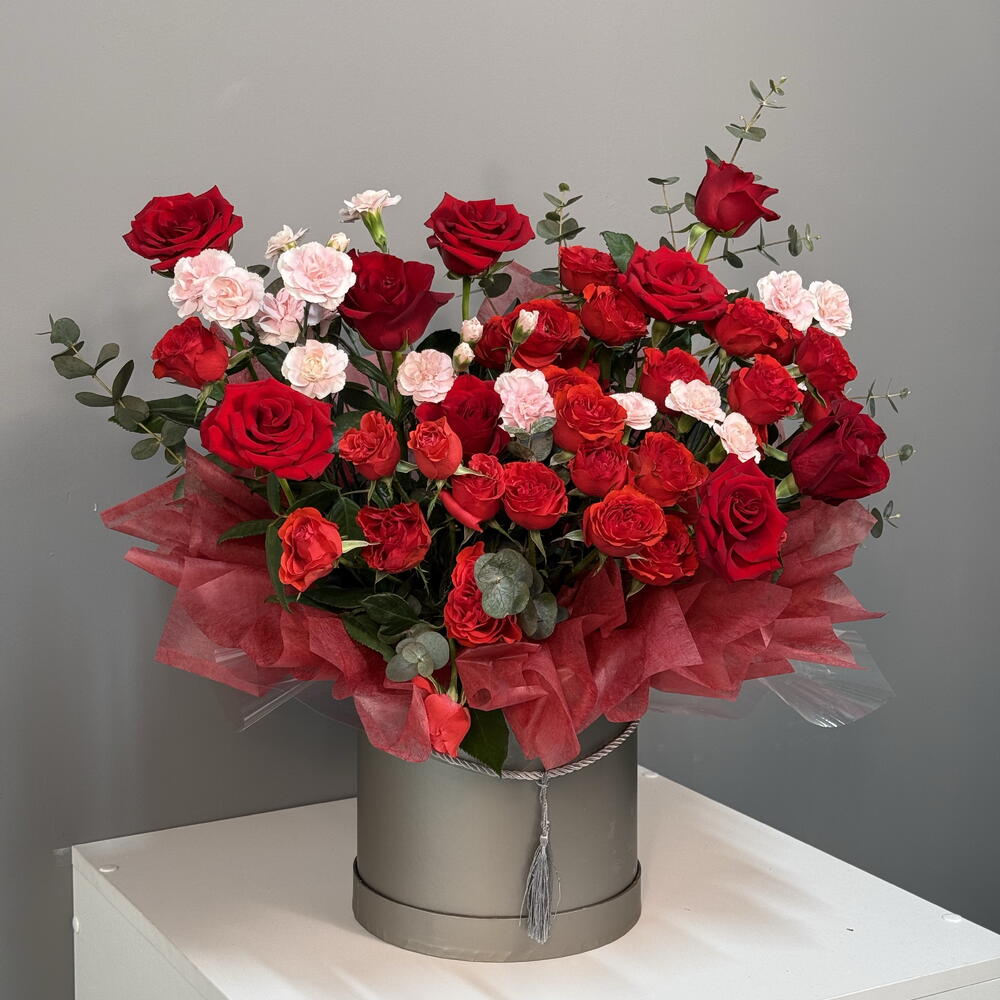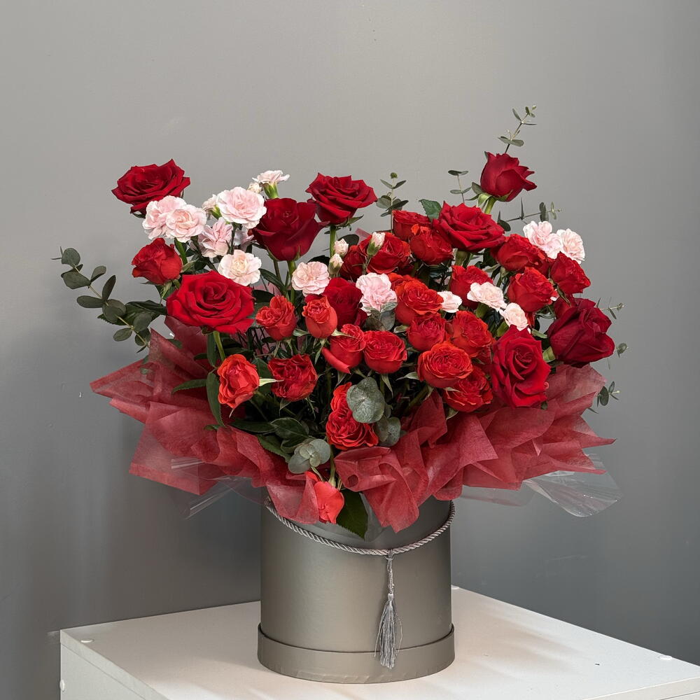 элегантная цветочная композиция, размещённая в цилиндрической серо-золотистой коробке с декоративным шнурком и кисточкой. Композиция состоит в основном из ярко-красных роз, дополненных нежно-розовыми мини-гвоздиками и зелёной листвой. Цветы обрамлены красной и прозрачной