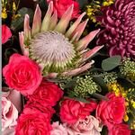 Лизиантус - 1 шт. Протея - 1 шт. Эвкалипт - 1 шт. Роза - 2 шт. орхидея - 3 шт. Спрей роза - 5 шт. хризантема бигуди - 5 шт.