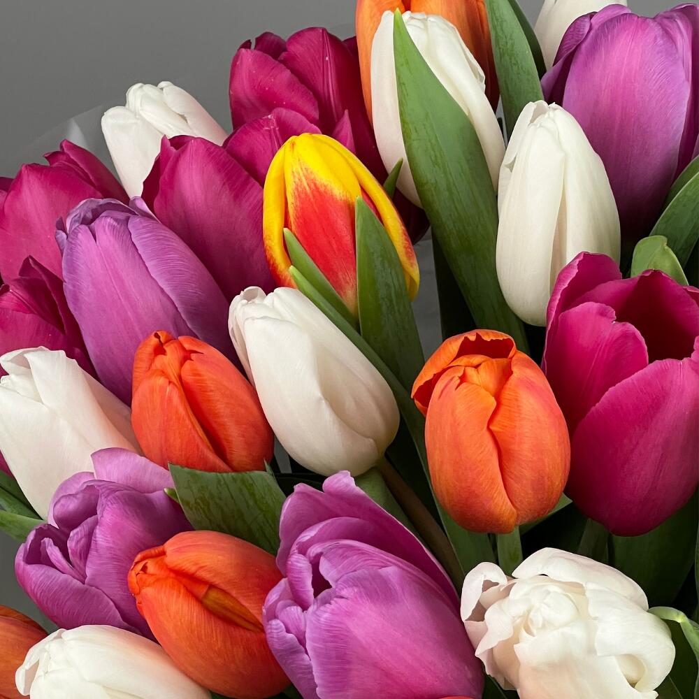 Гармония красок и нежности в одном букете! Насыщенные оттенки тюльпанов переплетаются в прекрасную весеннюю симфонию, которая согреет сердце получателя.