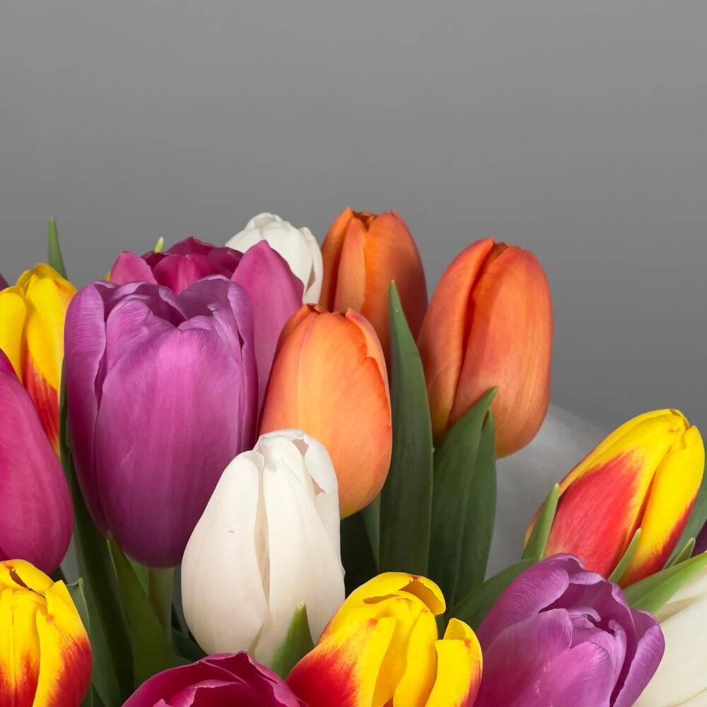Роскошный букет из тюльпанов самых жизнерадостных оттенков. Его яркость и свежесть говорят громче слов – просто подари настроение!