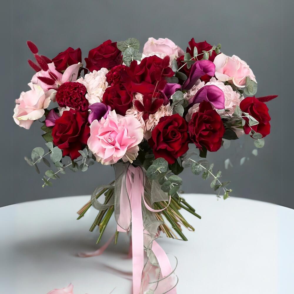 Шикарный букет в оттенках бордо, сливок и пудры — словно бокал дорогого вина в уютном свете вечера. Для тех, кто ценит глубину чувств и эстетику в каждом лепестке. Идеальный выбор для признания или изысканного подарка.
