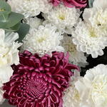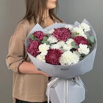 Смелое сочетание глубокого бордового и сочной снежной белизны — букет для тех, кто умеет говорить без слов. Строгая, но тёплая композиция: текстурные цветы создают ощущение объёма и рукотворной роскоши. Дарите, когда нужно поразить — этот букет запомнится надолго