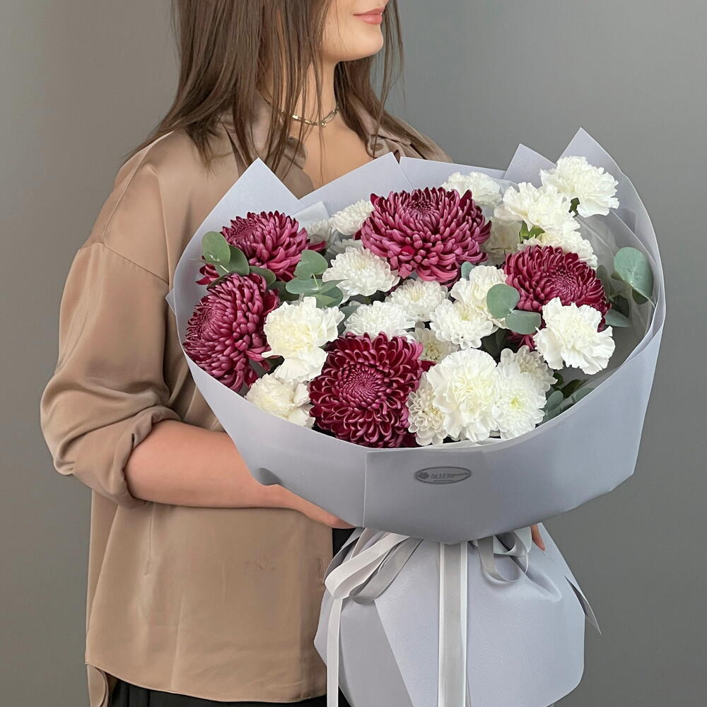 Смелое сочетание глубокого бордового и сочной снежной белизны — букет для тех, кто умеет говорить без слов. Строгая, но тёплая композиция: текстурные цветы создают ощущение объёма и рукотворной роскоши. Дарите, когда нужно поразить — этот букет запомнится надолго