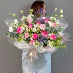 Этот букет будто собрал эмоции разных оттенков — малиновый драйв, розовая забота и голубой штрих вдохновения. Динамичный и живой, как момент счастья. Отличный выбор для яркой личности.